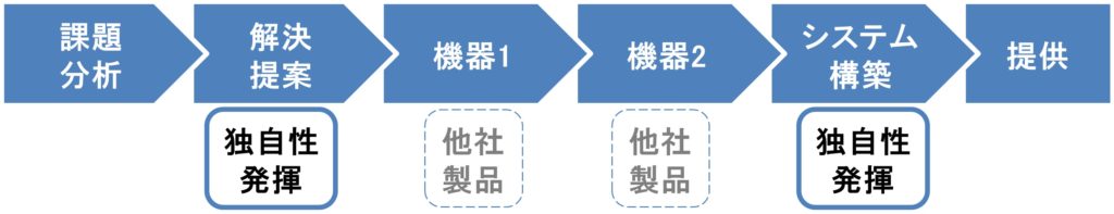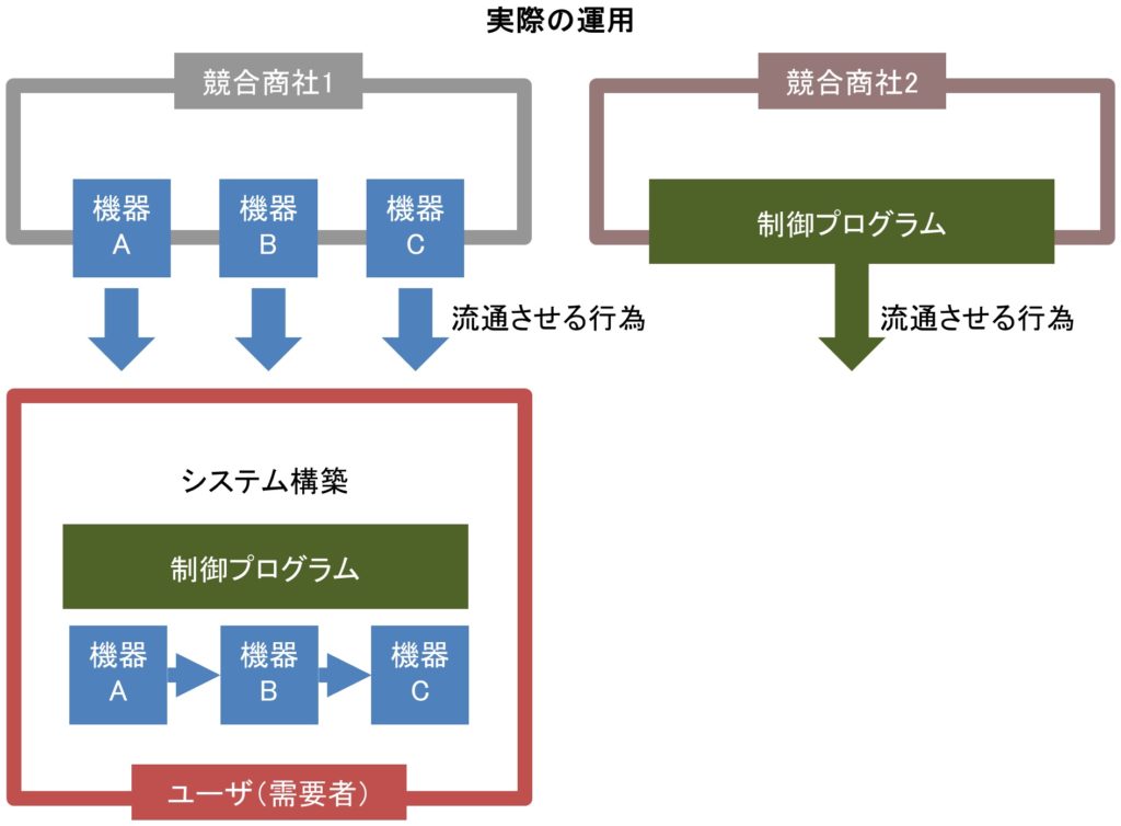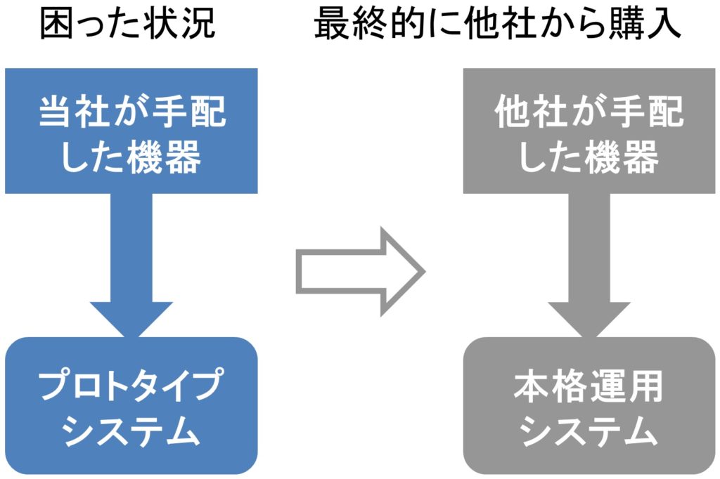 | ■ユーザは最終的に、競合商社1から機器A~Cを購入し、競合商社2から納入して、自社内でシステム構築している。 |