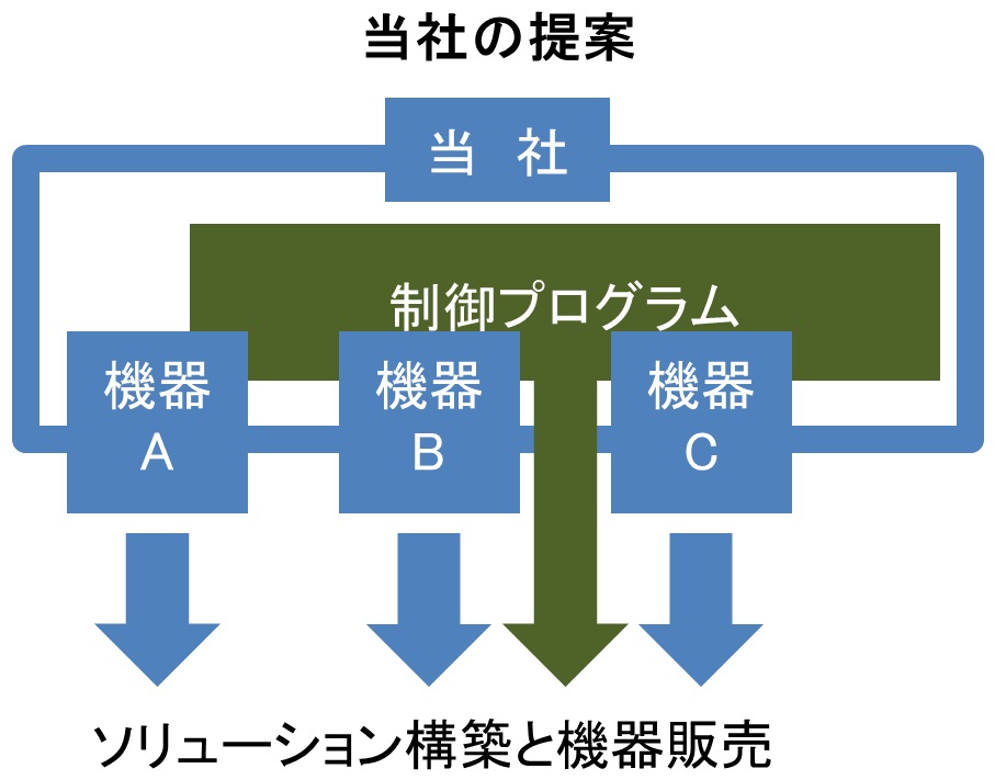 | ■当社は、ユーザに機器A~Cを制御プログラムで制御するソリューションシステムを提案した。機器A~Cは他社製品である。 |